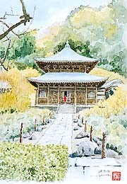 草花の豊富な瑞泉寺には、折に触れては描きにくるのだが、花の便りに参拝人も多い。谷戸の奥深い所に佇むお寺の所為か、描いている私の周りの山々から、しきりとウグイスの鳴き声が聞こえてくる。