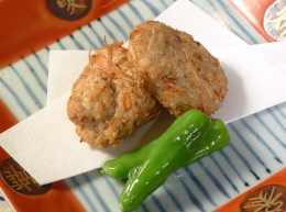 【材料】4人前 鯵4匹、青唐8本、木綿豆腐1/2丁、万能葱2本、午蒡1/2本、人参1/3本、生姜1片、 玉子1個、塩小さじ1/2、濃い口醤油小さじ2、赤味噌小さじ2、酒大さじ1、 味醂大さじ2、片栗粉大さじ2、サラダ油 |