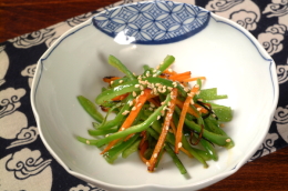 1 ピーマンは縦半分に切り、種とへたを取り、千切りにする。 2 人参は皮を剥いて、千切りにする。 3 生姜は皮を剥いて微塵切りにする。 4 鍋に胡麻油を熱し、生姜を香りよく炒め、人参、ピーマンを順に加えて炒め、 全体にしんなりとしたら、調味料を加え、最後に胡麻を振る。