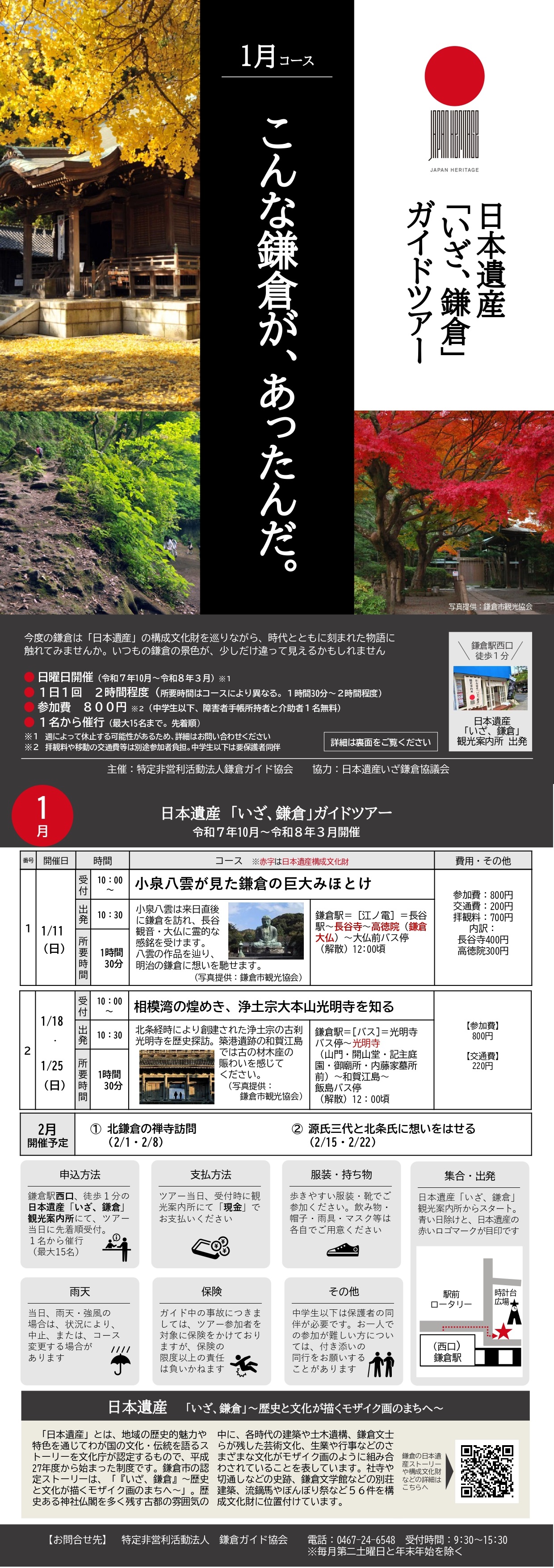 個人やグループの方のご希望のコース・ご希望時間でのガイド、私たち鎌倉ガイド協会が毎月企画する「古都鎌倉史跡めぐり」、修学旅行や校外学習のガイド、旅行会社の公募ツアーでのガイドなどを行っています。鎌倉と鎌倉周辺をより一層楽しんでいただくために、是非私どもをご利用下さい。 お問い合わせ:9:30~15:30 お問い合わせ電話:0467-24-6548 休日:第二土曜日、年末年始2025年12月27日(土)~2026年1月4日(日) Guided tours in Kamakura with Kamakura Guide Association (KGA)