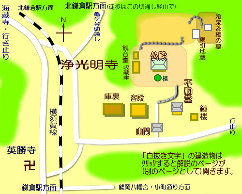 [ 所在地 ] 浄光明寺は JR 鎌倉駅の西口を出て100メートルほどまっすぐ進み、スーパーが正面に、また鎌倉市役所の庁舎が左手に見える、信号のある四つ角を右に曲がります。7~8分ほど北(横須賀線の東京方面に平行)に進むと、 鎌倉五山の一つである寿福寺が左手にあります。その先は英勝寺で、その前にある横須賀線の踏み切りを(右手または東方面)渡ります。100メートルほど進み、T地路に突き当たった ところで右折、そこから100メートルほどの左手にあります。 [浄光明寺の古建築] 山門、仏殿、不動堂を地図から見る場合は、下記の図の「白抜きの文字」をクリックしてください。新たなページとして開きます。