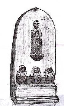 | 舟型 正面中央に蓮台に立つ阿弥陀如来の像が彫られています。 右側には「奉供養庚申(以下不明)」、左側には「維(以下不明)」と刻んであるようです。 現在、造立年に関する銘は読み取れないようです。 下辺には三猿が彫られています。 造立年代について:昭和40年3月30日に有形民俗資料として指定され、「鎌倉の文化財 第三集」で寛文十一年(1671)とされています。 左の「維」の下に「寛文十一」などが彫られていたようです。 上記の資料以外の市の資料2点のいずれも「寛文十一年」としていますが、銘についての記録が少しずつ異なり、近年かなり読みにくくなっていたようです。 庚申塔の現状 | 1基 | 記録の通り保存されています。(平成14年11月16日) |