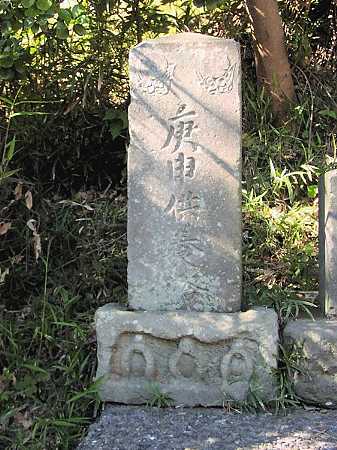 上辺に日月を浮き彫りし、中央に「庚申供養塔」と彫っています。