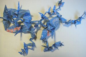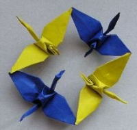 右側、は各鶴の最初の折りを角に向かって折る→ |