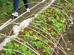 まず、苗床の覆いを外し、苗床を移植作業場所に運びます。