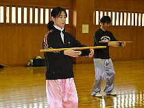 対練の稽古を見て、棒ストレッチや次に紹介する太極剣と共に、四年前の取材時に比べて練習のメニューが増えたこと、増えたメニューをスムーズにしかも淡々とこなすことが出来ていることなど、天神太極拳倶楽部が進化した証しだと思いました。 このページのTop ● 太極剣太極剣は両刃(刃は付いていない)の直刃を用いたものです。 ![]() ![]() この日の練習は、二列に並んで相対して向き合って、お互いに胴を切り払う動作の練習でした。 ![]()