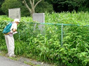 その先右手の草むらが生い茂っているところは、鶴岡八幡宮に仕える供僧たち が住んだ、二十五坊跡で、御谷(おやつ)とも呼ばれます。 戦後、ここで大規模な宅造計画が進もうとした時、貴重な遺跡を守ろうとした大仏次郎らの運動によって保存されることになりました。 「古都保存法発祥の地」の標識 が建っていますが、この保存運動をきっかけとして「古都保存法」が制定された からです。 県道に戻り、小袋坂洞門をくぐり建長寺前に出ます。 ● 建長寺とその界隈鎌倉五山筆頭の建長寺の前あたりには、『原泉』『長流』などの句集 がある俳人の荻原井泉水が晩年まで住んでいました。