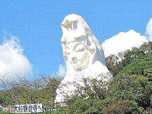 大船駅西口へ駅コンコースを抜けて西口に出ると、L字型の歩道橋が1年ほど前に出来ていて、バスターミナルまで道路を横断せずに行けるようになっていました。紺碧の空に白い大船観音の顔面が見えました。江ノ島に行くモノレールも見えます。